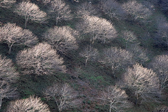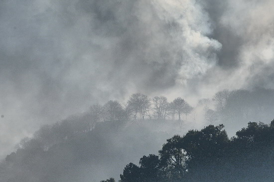 Zuerst vermutete ich Waldbrände als Grund für die Rauchschwaden, die Land-schaftsaufnahmen in der Totalen vereitelten. Tatsächlich waren es aber kontrollierte Feuer; die Esskastanien werden in den Wintermonaten gestutzt und das entfernte Holz wird von den Bergbauern verbrannt.