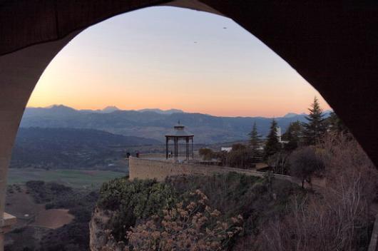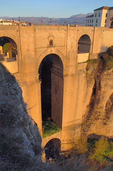 Die Brücke von Ronda. Sie verbindet erst seit 1793 die Stadtteile von Ronda und überwindet die 150 m tiefe, messerscharfe Schlucht. Der Baumeister der Brücke kam durch einen Sturz von seiner Brücke ums Leben. Man erzählt, er habe Selbstmord begangen, weil er ein so perfektes Bauwerk nie wieder konstruieren könne.